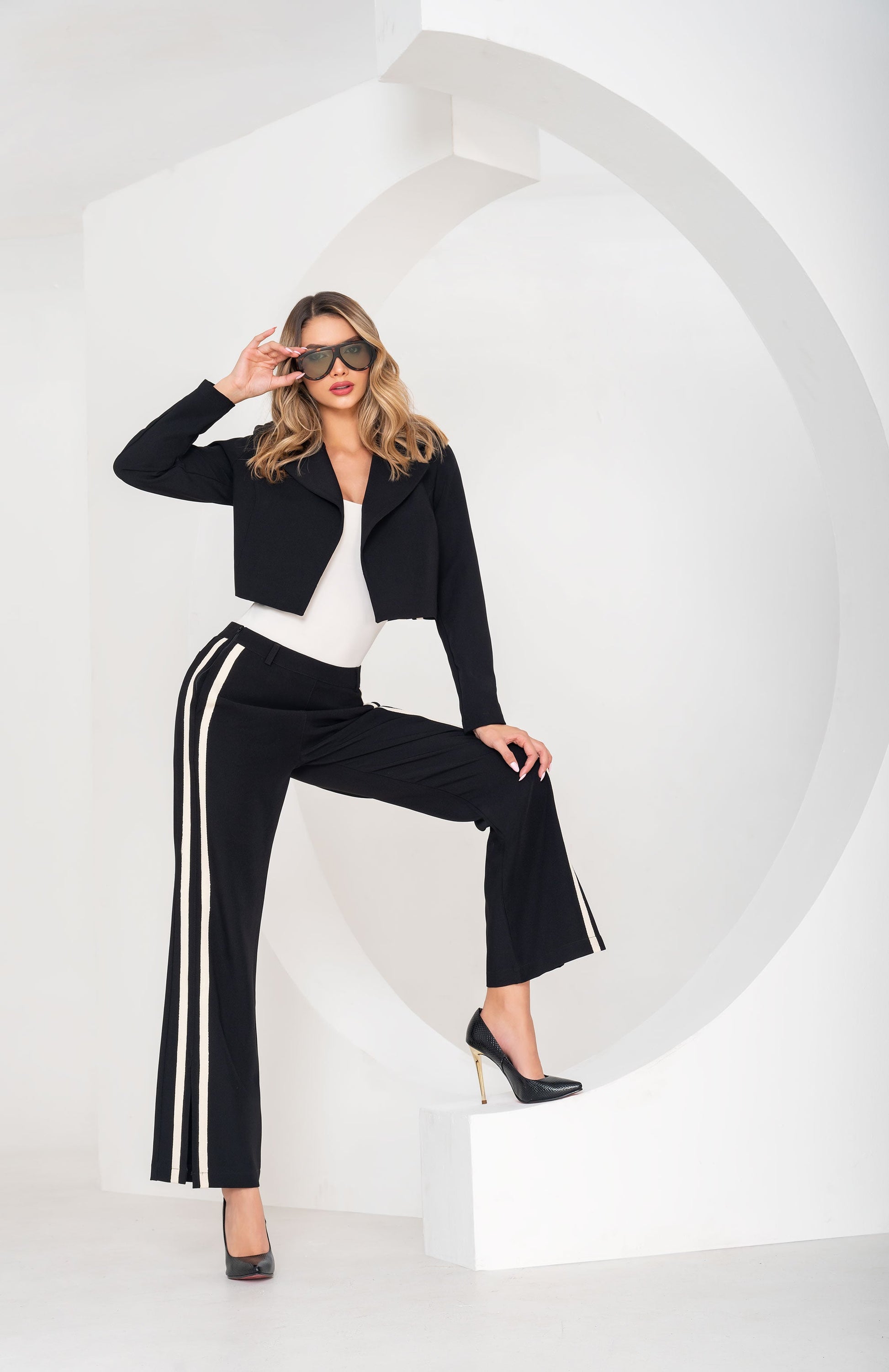 Pantalón Tiro Alto 1 Botón - Bota Palazzo - Negro Con Rayas Ref R-031